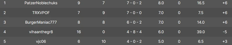 And let’s talk about @vihaanthegr8—they’ve played the most games of anyone and are still very much in the mix. Will they play spoiler, or can they sneak into a top spot? @vjc06 (5.0 points) still has time to make their move as well, so keep an eye on them.
