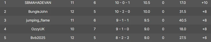 What a season it’s shaping up to be! @SBMAHADEVAN is leading the charge with a mighty 10.5 points and a near-flawless 10-0-1 record. But let’s not get too comfortable—@BungleJohn is just half a point behind and has already shown they can go toe-to-toe with the best.