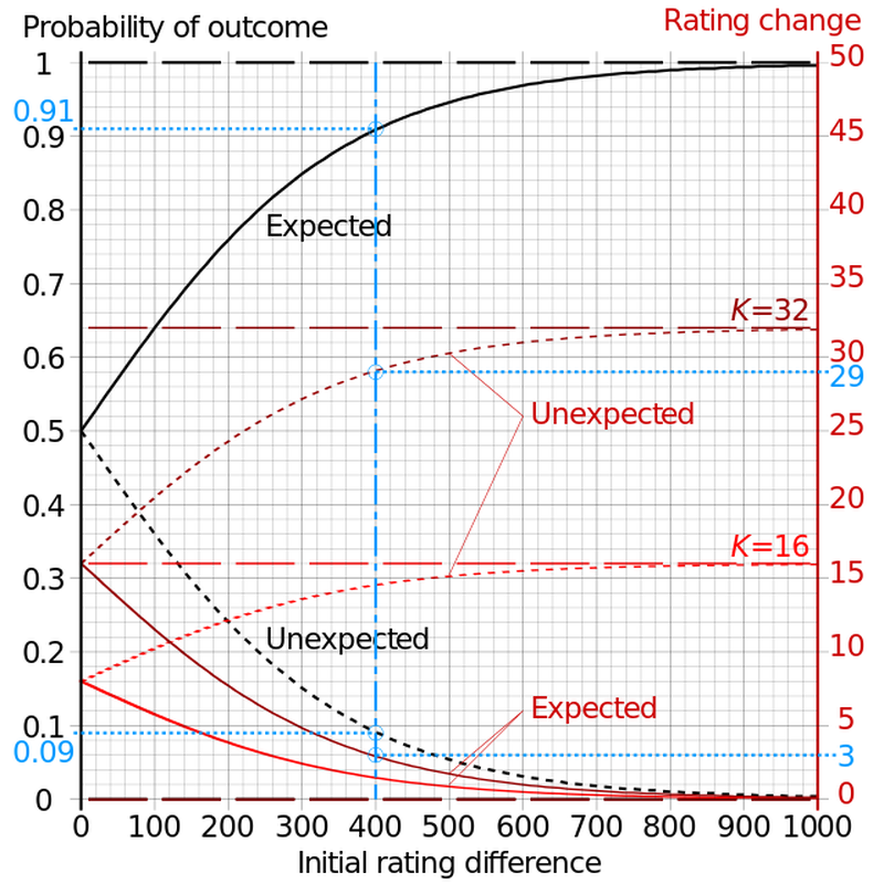 These graphs show you how winning becomes an increasingly long shot for a weaker player as the rating difference between players grows. Cmglee, CC BY-SA 3.0 <https://creativecommons.org/licenses/by-sa/3.0>, via Wikimedia Commons
