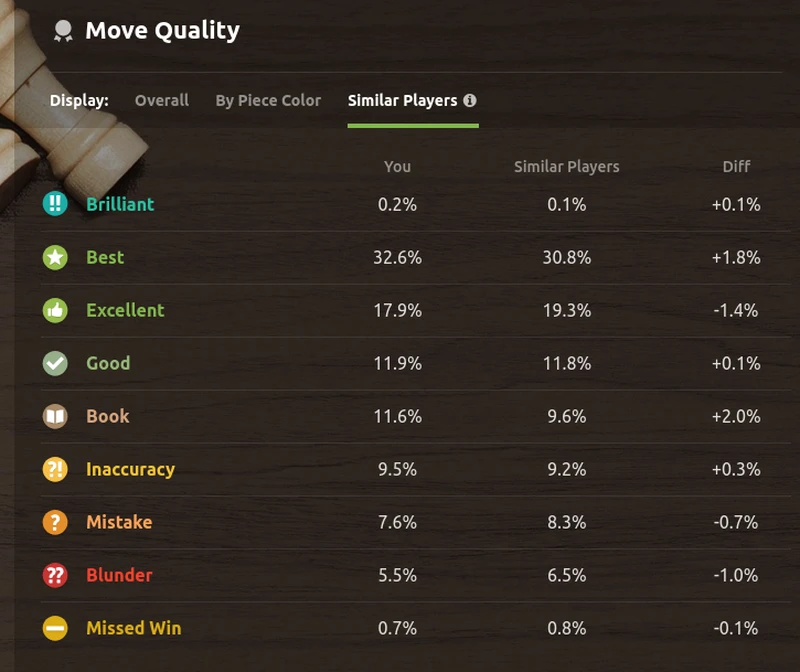 When I first started playing chess online a few years ago, the prospect of reviewing my games afterwards with an engine was very exciting. From a learning and improvement perspective, seeing the moves that were labeled as blunders and inaccuracies is probably more useful, but I couldn't (and still can't!) help being excited to see the occasional moves that were labeled as being exceptionally good. If you play at chess.com, their game review algorithm assigns labels to your moves that include "Great" and "Brilliant," so you can imagine your own games marked up like the ones I read about in Fischer's book. For ordinary players like me, these brilliant moves ought to be fairly rare, and in my case they certainly are! Here's my breakdown of various move types from the CC "Insights" panel of my Blitz performance.