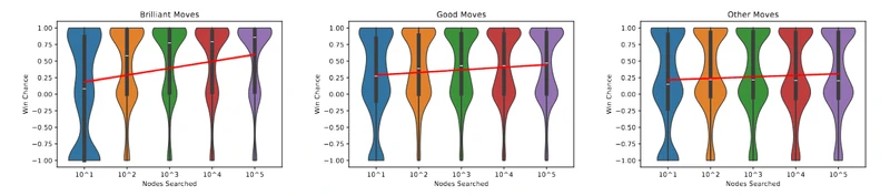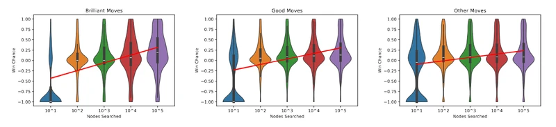 I know the axes might be a little tough to read here, so let me tell you the key things to notice here. As you move from left-to-right across each panel, the number of nodes that Leela gets to inspect increases by powers of 10. These squeeze-y shapes are a Violin plotof the data, which is intended to give you a sense of how the data is distributed across y-values at each stop on the x-axis. A skinnier part of the shape means that there are fewer data points there, while a wider part means lots of data is concentrated there. I hope you can see that it looks like a meaningful difference between Brilliant moves (leftmost panel) and the Other moves (rightmost panel) is that the red line connecting the mean values of these shapes has a steeper slope on the left. What does this mean? It suggests that the thing about Brilliant moves is that they start to look better when the engine gets to look at much more of the game tree. A shallow look isn't so exciting, but a deeper look makes a Brilliant move start to shine.