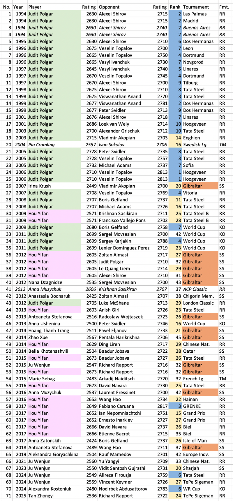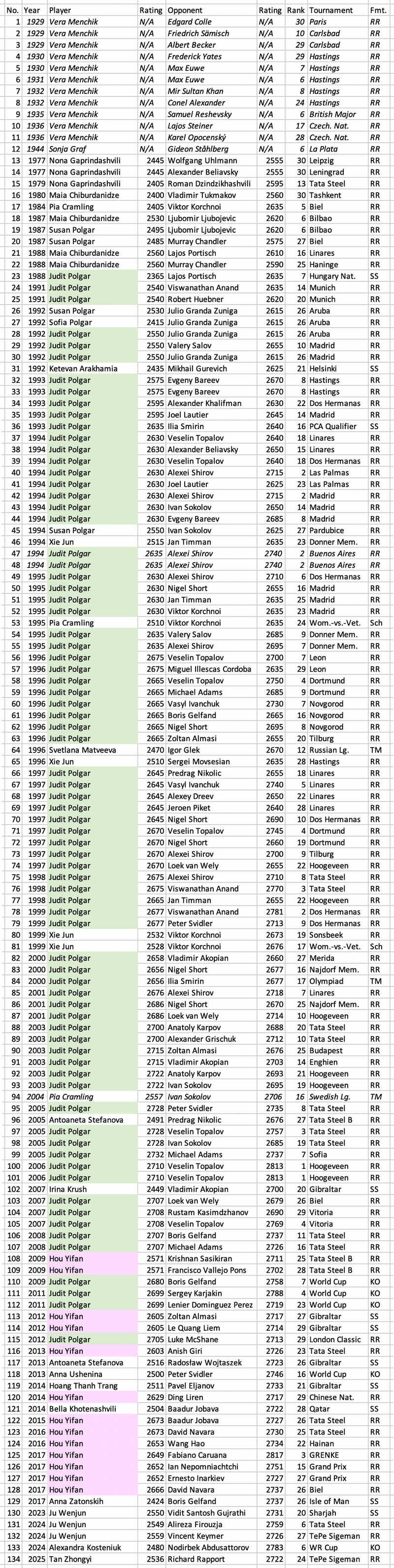 Tan had beaten a 2700+ player! But wait, how often does this happen? How many women have done this? These are the questions we obviously want to know the answer to. Judit Polgar was 2700+ herself, and Hou Yifan came within 15 Elo of that mark. Obviously, they have done it, and done so many times. But for other women who never approached 2700 rating, those answers are not well-tracked. Indeed, when press coverage of TePe Sigeman came out, no journalist put the victory into historical context. They would need a list of all the women who have beaten super-GMs, but no one has ever made such a list — until now.