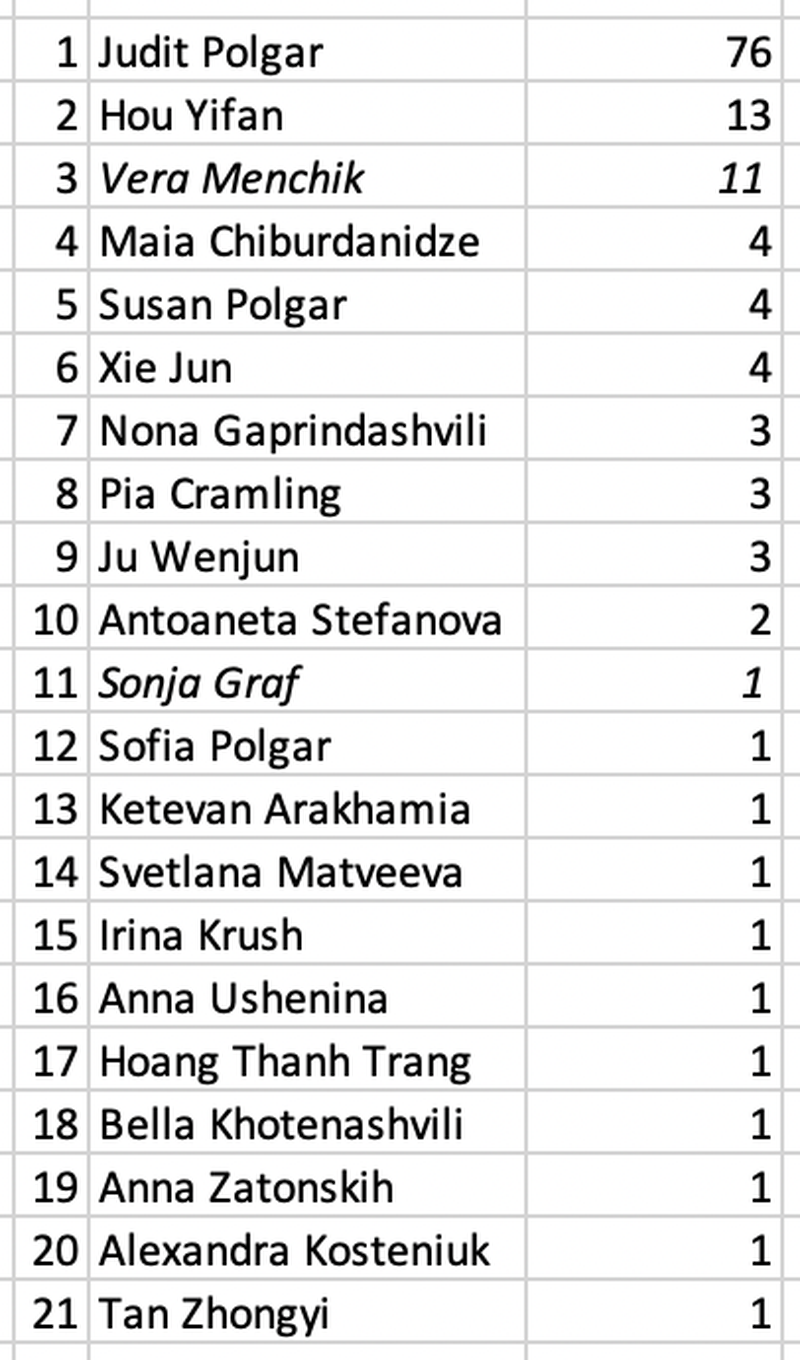The players unfairly excluded from the super-GM victory list include famed five-time Women’s World Champions Maia Chiburdanidze and Nona Gaprindashvili, and none other than Judit herself. Even though Judit did have 32 super-GM victories, that severely downplays her level of success. It is far more telling that she had 76 Top 30 victories, and more than half of the victories on the list overall (76 / 134).