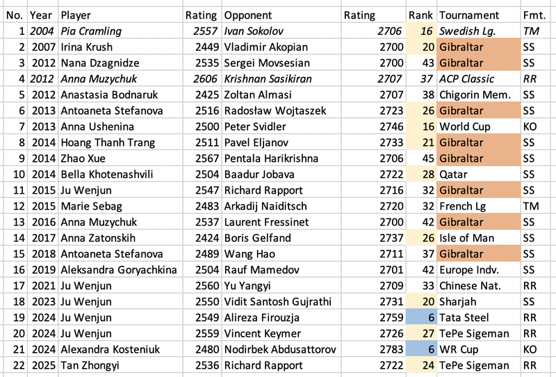 Back to our original goal: When Tan Zhongyi beat Richard Rapport, she became the 18th woman to beat a super-GM. It was just the 22nd time it happened by someone other than Judit or Hou Yifan. Including Judit and Hou Yifan, Tan’s victory was the 36th-highest-rated win by any woman ever out of 71 super-GM victories. She also became the 21st woman to beat a Top 30 player, and it was just barely in the top 100 of highest-ranked wins by women all-time.