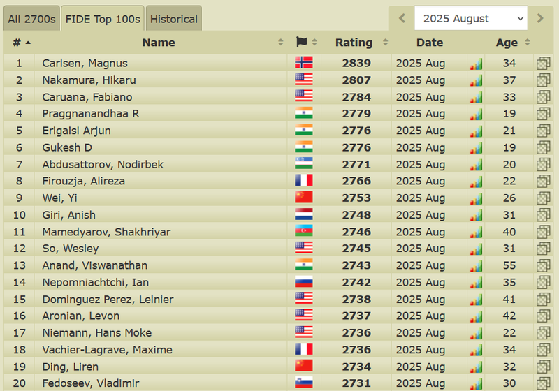 Nakamura, Caruana, So, Dominguez Perez, Aronian and Niemann are the Americans in the top 20.