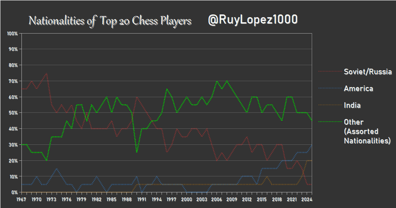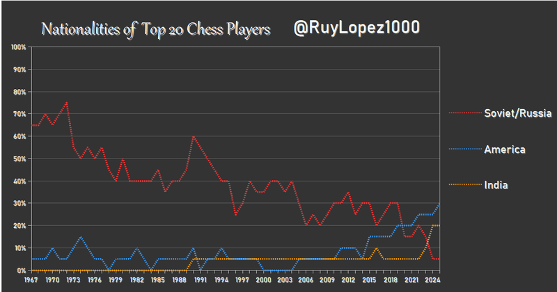 This graph shows how the Soviet School of Chess declined over time. Vishy Anand carried India starting in 1990 for decades. Gukesh, Pragg, Erigaisi and Vidit were the products of the chess boom in India. US chess 'grew' through paying players from different countries to join.