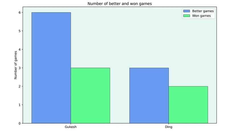 Gukesh was much better in 6 games but “only” managed to win 3 of these games. On the other hand, Ding has only failed to convert one game where he was much better.