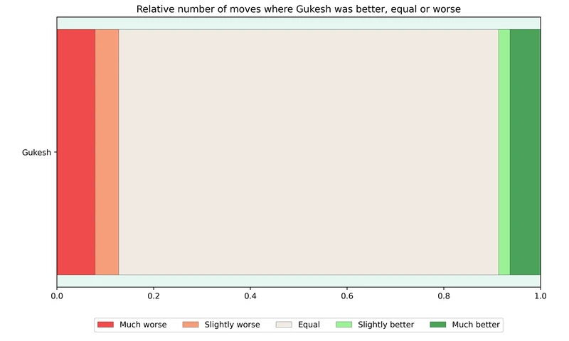 The graph shows the relative number of moves that Gukesh was much better (evaluation greater than +1), slightly better (evaluation between +1 and +0.5), equal (evaluation between +0.5 and -0.5), slightly worse (evaluation between -0.5 and -1) and much worse (evaluation below -1). Note that the graph for Ding would be the inverse of the graph above.