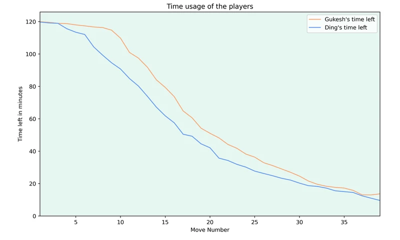 While Ding’s time usage looks much less extreme (this is due to some games that were played quickly from both players), it’s clear that Ding fell behind on the clock early on in the games and while he started to narrow the gap around move 15, he never quite caught back up with Gukesh’s time.